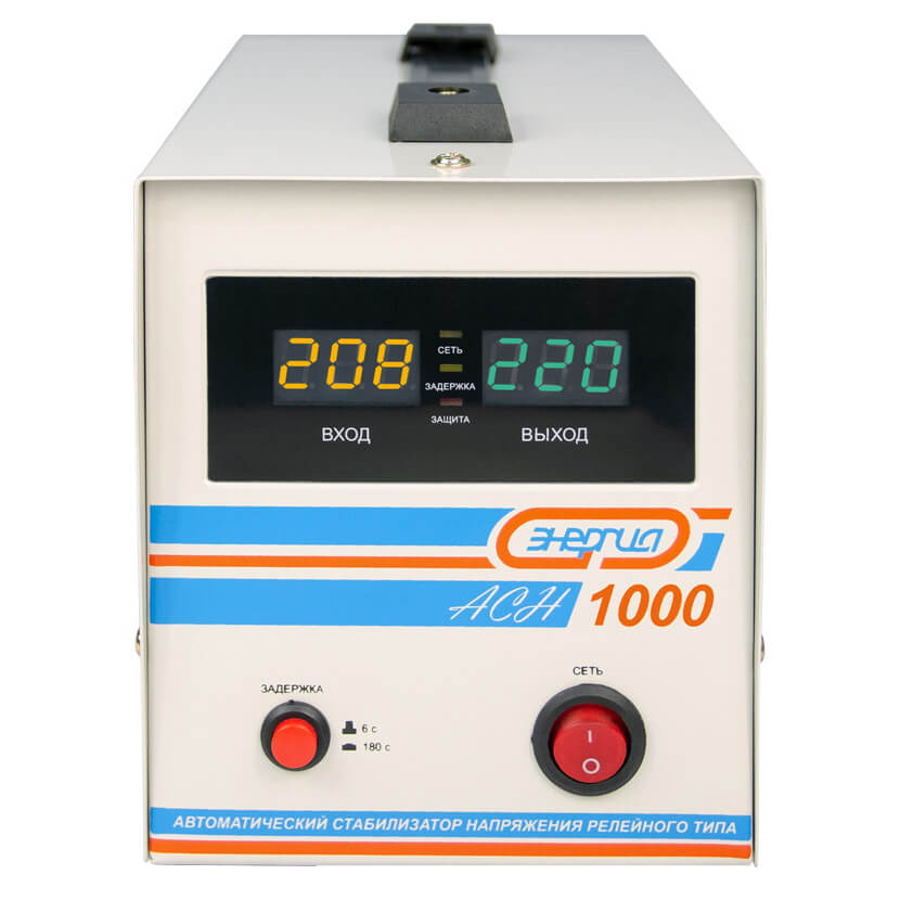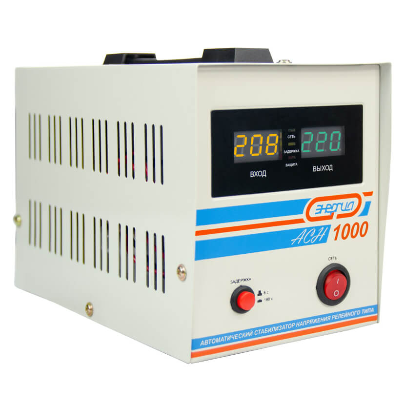 Однофазный релейный стабилизатор напряжения Энергия АСН-1000 применяется для обеспечения потребителей напряжением 220В как при кратковременных колебаниях, так и при длительном падении/повышении напряжения в электросети. Прибор рассчитан на подключение небольшого количества электроприборов суммарной мощностью до 1кВт.