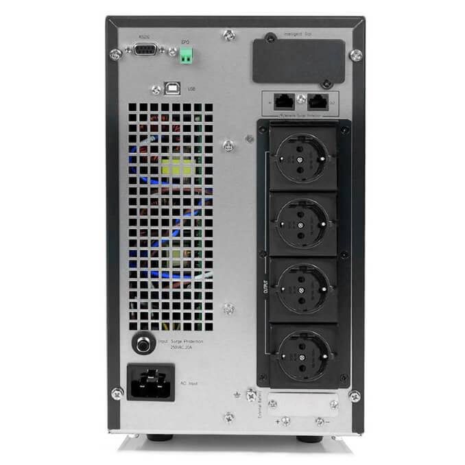 ИБП выполнен по современной технологии «on-line», заключающейся в преобразовании переменного тока в постоянный и его последующей регенерации обратно в переменный. При таком режиме аккумуляторы включены в работу постоянно, и, переход на питание от аккумуляторов происходит мгновенно. А выходное напряжение не подвержено влиянию колебаний в электросети, и поддерживается с высокой точностью и идеальной синусоидальной формой в широком диапазоне колебаний и скачков входного напряжения (110 – 288 В).