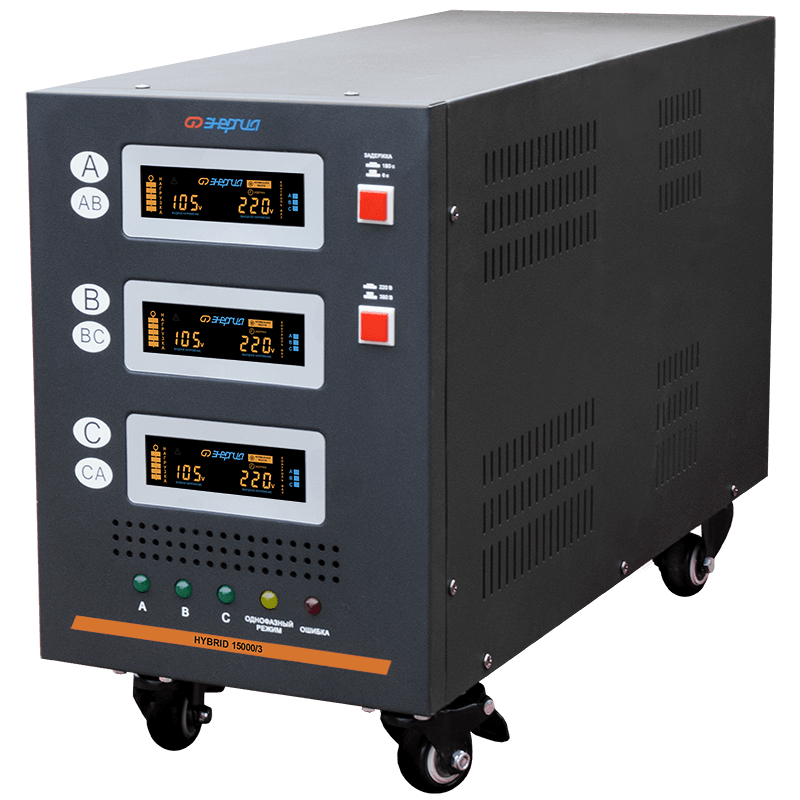 Энергия Hybrid 15000/3 относится к классу гибридных (комбинированных) стабилизаторов и сочетает в себе плавность регулировки электромеханических стабилизаторов и возможность работы на крайне низких напряжениях (до 80В фазного напряжения) электронных. Фактически, в одном корпусе собраны два стабилизатора: электромеханический и электронный, позволяя сочетать лучшие черты обоих типов. Стабилизатор отличается высокой точностью (погрешность всего 3%) и режимом плавной регулировки, обеспечивающий максимально комфортный режим питания для чувствительной техники. Он не искажает синусоидальную форму напряжения и не создает помех при работе, поэтому может использоваться в таких ответственных областях как питание медицинского оборудования, аудио и видео-аппаратуры и других устройств, чувствительных к резким перепадам напряжения и сетевым помехам.