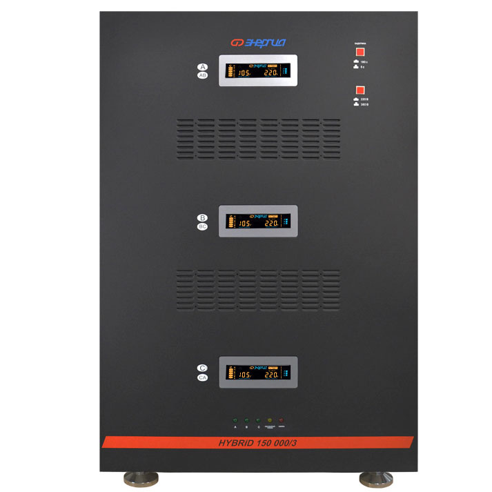 Энергия Hybrid 150000/3 относится к классу гибридных (комбинированных) стабилизаторов и сочетает в себе плавность регулировки электромеханических стабилизаторов и возможность работы на крайне низких напряжениях (до 80В фазного напряжения) электронных. Фактически, в одном корпусе собраны два стабилизатора: электромеханический и электронный, позволяя сочетать лучшие черты обоих типов. Стабилизатор отличается высокой точностью (погрешность всего 3%) и режимом плавной регулировки, обеспечивающий максимально комфортный режим питания для чувствительной техники. Он не искажает синусоидальную форму напряжения и не создает помех при работе, поэтому может использоваться в таких ответственных областях как питание медицинского оборудования, аудио и видео-аппаратуры и других устройств, чувствительных к резким перепадам напряжения и сетевым помехам.