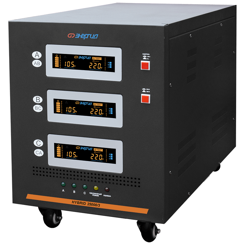 Энергия Hybrid 25000/3 относится к классу гибридных (комбинированных) стабилизаторов и сочетает в себе плавность регулировки электромеханических стабилизаторов и возможность работы на крайне низких напряжениях (до 80В фазного напряжения) электронных. Фактически, в одном корпусе собраны два стабилизатора: электромеханический и электронный, позволяя сочетать лучшие черты обоих типов. Стабилизатор отличается высокой точностью (погрешность всего 3%) и режимом плавной регулировки, обеспечивающий максимально комфортный режим питания для чувствительной техники. Он не искажает синусоидальную форму напряжения и не создает помех при работе, поэтому может использоваться в таких ответственных областях как питание медицинского оборудования, аудио и видео-аппаратуры и других устройств, чувствительных к резким перепадам напряжения и сетевым помехам.