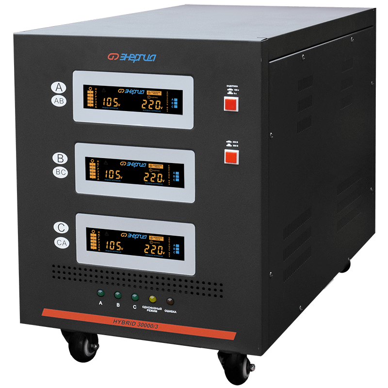 Энергия Hybrid 30000/3 относится к классу гибридных (комбинированных) стабилизаторов и сочетает в себе плавность регулировки электромеханических стабилизаторов и возможность работы на крайне низких напряжениях (до 80В фазного напряжения) электронных. Фактически, в одном корпусе собраны два стабилизатора: электромеханический и электронный, позволяя сочетать лучшие черты обоих типов. Стабилизатор отличается высокой точностью (погрешность всего 3%) и режимом плавной регулировки, обеспечивающий максимально комфортный режим питания для чувствительной техники. Он не искажает синусоидальную форму напряжения и не создает помех при работе, поэтому может использоваться в таких ответственных областях как питание медицинского оборудования, аудио и видео-аппаратуры и других устройств, чувствительных к резким перепадам напряжения и сетевым помехам.