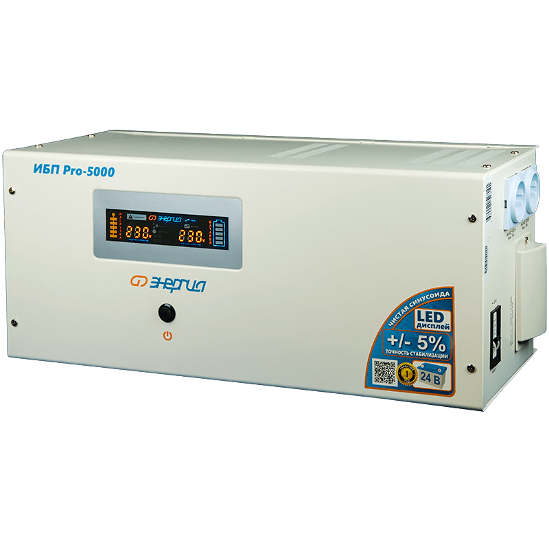 Энергия ИБП Pro 5000 используется в системах бесперебойного питания с внешними аккумуляторами и позволяет подобрать количество и ёмкость АКБ под требуемое время автономной работы. Благодаря цифровому ШИМ-преобразователю, инвертор выдаёт чистую синусоиду, что делает возможным использовать его с такими чувствительными приборами как газовые котлы, медицинское оборудование, и в других случаях, когда обычные ИБП с модифицированной синусоидой использовать нельзя.