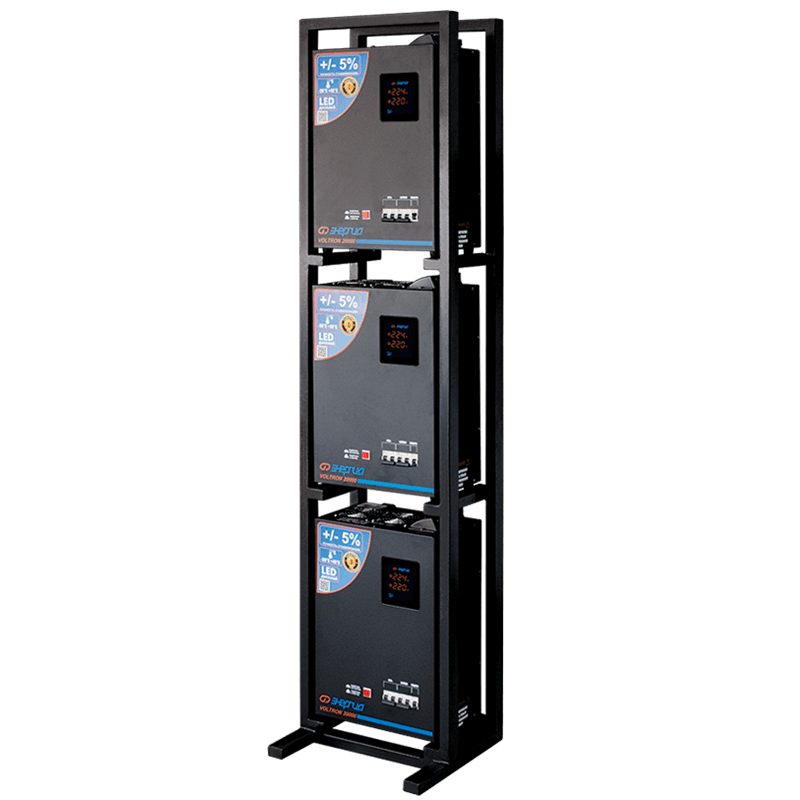 Коммутационная стойка Энергия 163-38-24 предназначена для размещения и подключения стабилизаторов напряжения Энергия Voltron мощностью 15 и 20кВА к трехфазной сети. Стойка максимально адаптирована к данным стабилизаторам по размерам и дизайну. Использование стойки упрощает электромонтаж комплекта стабилизаторов и позволяет минимизировать занимаемую площадь, за счет расположения стабилизаторов друг над другом. При этом остается открытый доступ ко всем элементам управления и коммутационным блокам стабилизаторов, а так же не нарушается режим вентиляции.