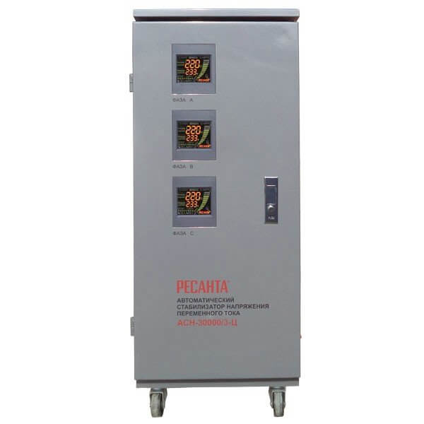 Стабилизатор Ресанта АСН-30000/3-Ц относится к релейному типу стабилизаторов, которые отличаются высокой скоростью реакции на изменения напряжения. Стабилизатор оснащен фильтрами сетевых помех, предотвращающими искажение частотной синусоиды, микропроцессорным управлением и цифровым индикатором напряжения. Он способен обеспечить надежную защиту от скачков напряжения, импульсных перенапряжений и короткого замыкания.