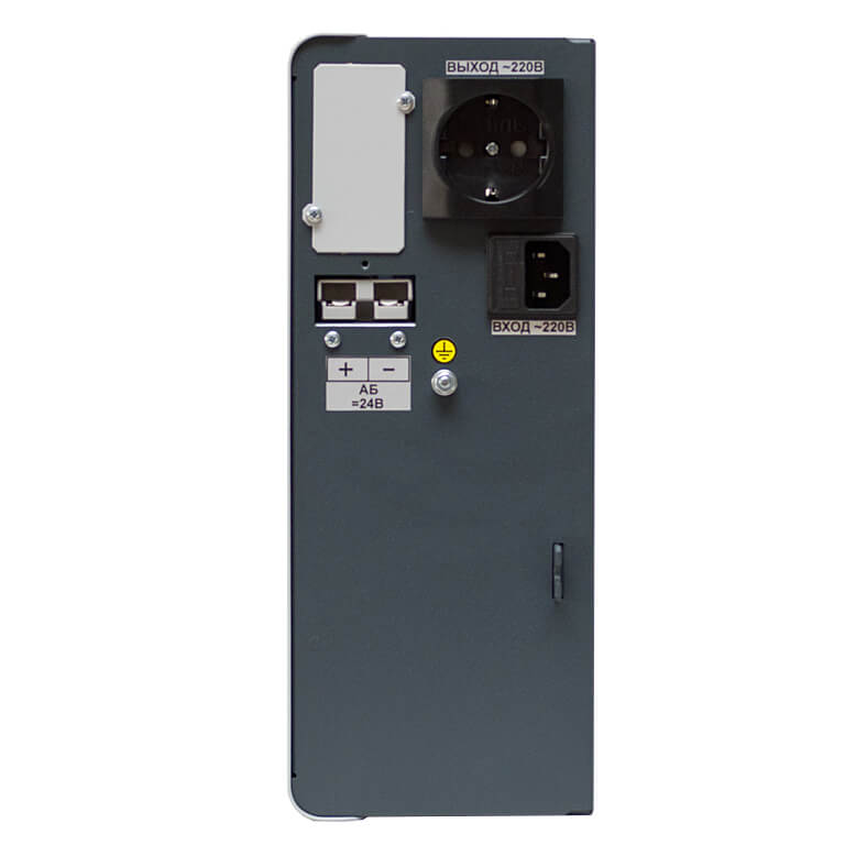 ИБП имеет удобное настенное исполнение, оснащен панелью управления с ЖК-дисплеем и LED-индикаторами. Имеет встроенные аккумуляторные батареи емкостью 9 Ач (2 шт.), обеспечивающие стандартное минимальное время автономной работы (10..60 мин). А подключение дополнительного внешнего батарейного модуля BM-24-18/BM-24-27 позволяет увеличить время автономной работы вплоть до 3-4 часов.