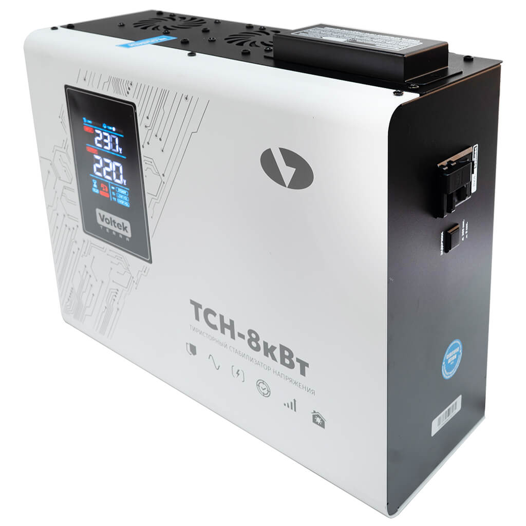 Стабилизатор Voltek ТСН-8кВт оснащен комплексом систем, обеспечивающим надежную защиту как потребителей, так и самого стабилизатора от любых нештатных ситуаций, и рассчитан на непрерывную круглосуточную работу в условиях больших по значению и длительности отклонений напряжения от номинального значения.