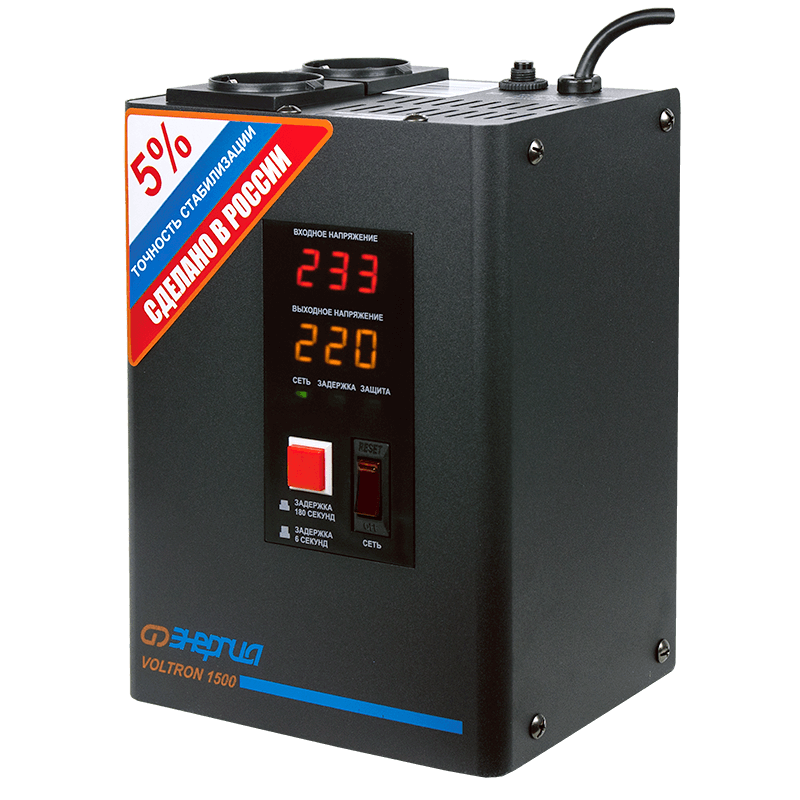 Стабилизатор Энергия Voltron 1500 предназначен для автоматического поддержания 220В и устранения скачков и просадок напряжения. Отличительной чертой стабилизаторов серии Voltron является широкий диапазон входных напряжений (95..280В), высокая точность стабилизации (погрешность всего 5%), и так же температурный диапазон работы, допускающий эксплуатацию стабилизатора при отрицательных температурах (-30..+40°С).