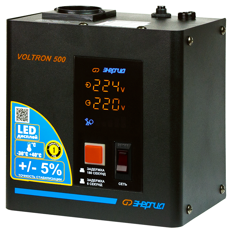 Стабилизатор Энергия Voltron 500 предназначен для автоматического поддержания 220В и устранения скачков и просадок напряжения. Отличительной чертой стабилизаторов серии Voltron является широкий диапазон входных напряжений (95..280В), высокая точность стабилизации (погрешность всего 5%), и так же температурный диапазон работы, допускающий эксплуатацию стабилизатора при отрицательных температурах (-30..+40°С).